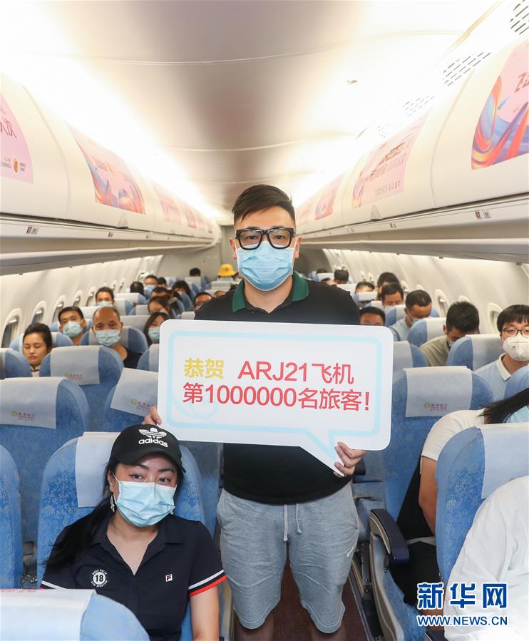 7月20日晚,ARJ21飞机的第100万名乘客在机舱内拍照留念。 新华社记者 丁汀 摄