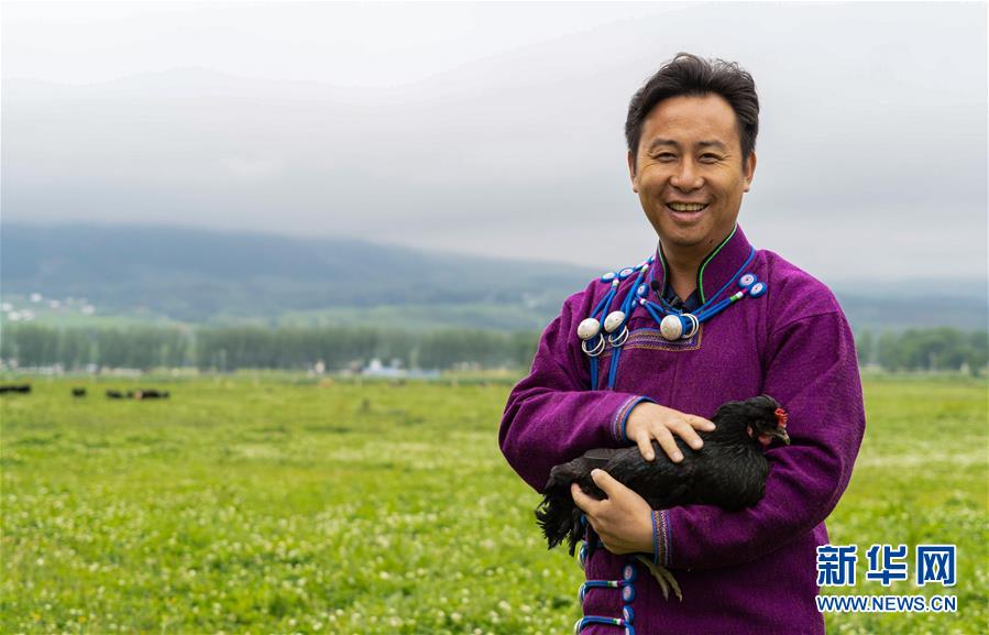 7月20日,在布拖县比聪中药材种养殖农民专业合作社的养鸡场,阿俄比聪抱着一只产绿壳蛋的鸡。新华社记者 江宏景摄