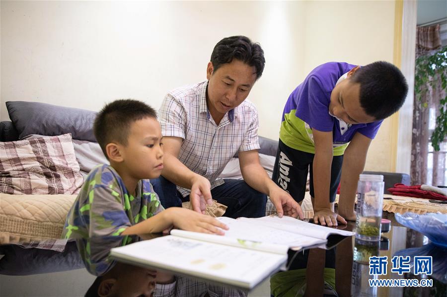7月16日,阿俄比聪在西昌市的家里督促检查两个儿子的作业。新华社记者 江宏景摄