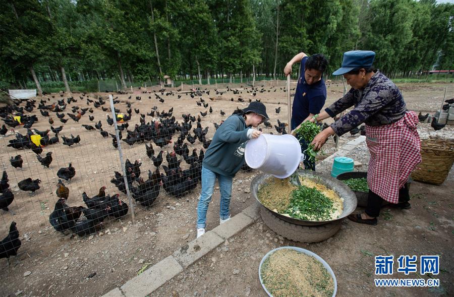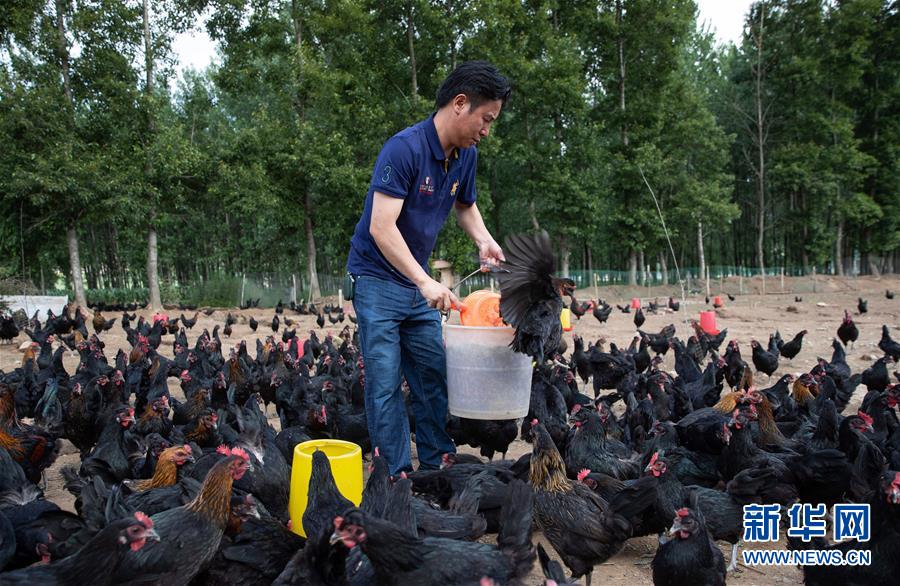 7月20日,在布拖县比聪中药材种养殖农民专业合作社的养鸡场,阿俄比聪在喂鸡。新华社记者 江宏景摄