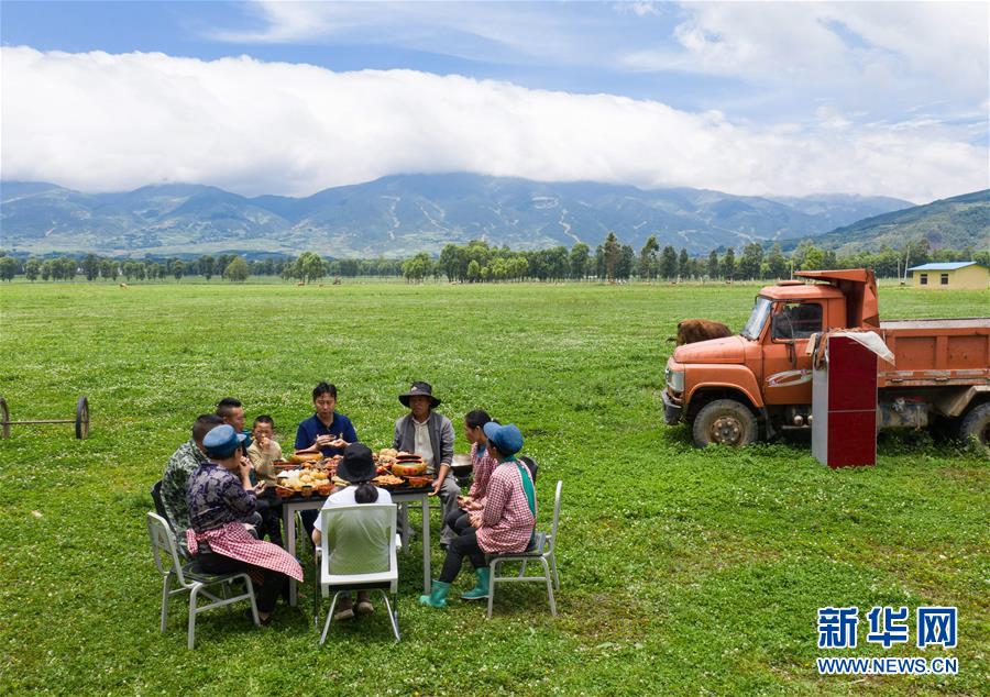 7月20日,在布拖县比聪中药材种养殖农民专业合作社的养鸡场,阿俄比聪和父母、兄弟姐妹在一起吃午饭,这是他们家每月一次的团聚。新华社记者 江宏景摄