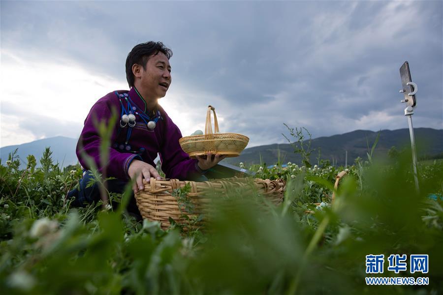 7月20日,在布拖县比聪中药材种养殖农民专业合作社的养鸡场,阿俄比聪在直播,推介他的绿壳鸡蛋。新华社记者 江宏景摄