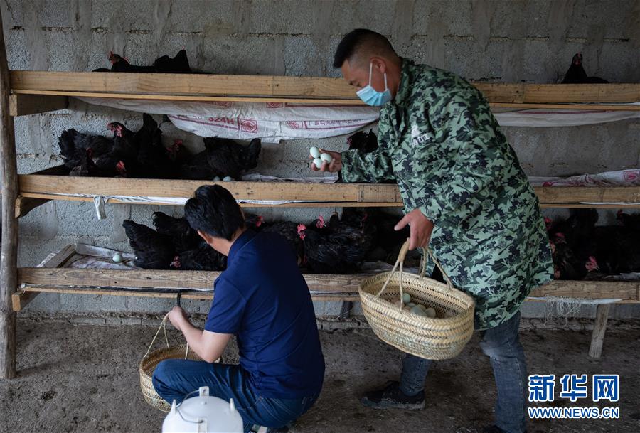 7月20日,在布拖县比聪中药材种养殖农民专业合作社的养鸡场,阿俄比聪和弟弟比哈在鸡舍里捡绿壳蛋。新华社记者 江宏景摄