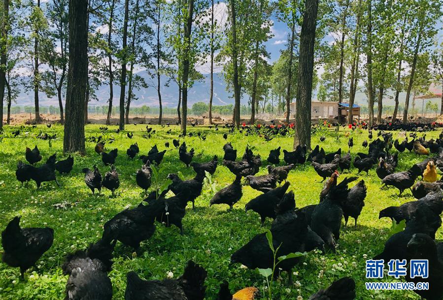 7月20日,布拖县比聪中药材种养殖农民专业合作社的养鸡场一角,鸡在林中觅食。新华社记者 江宏景摄