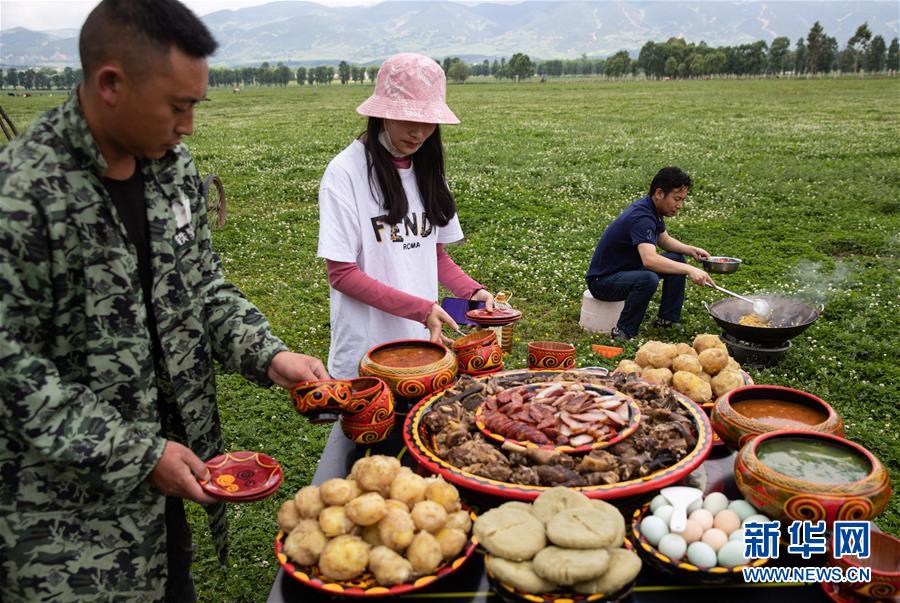 7月20日,在布拖县比聪中药材种养殖农民专业合作社的养鸡场,阿俄比聪(右)在做菜。当天是他和父母、兄弟姐妹每月一次的团聚。新华社记者 江宏景摄