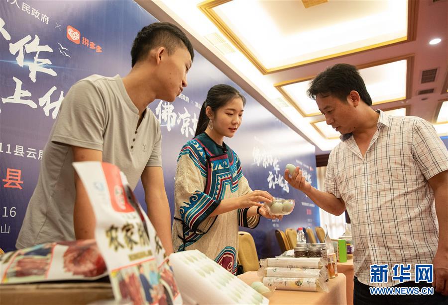 7月16日,阿俄比聪在西昌市举行的佛山—凉山消费扶贫周活动现场,咨询一家参展养鸡场发展绿壳鸡蛋的情况。新华社记者 江宏景摄