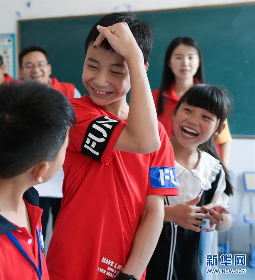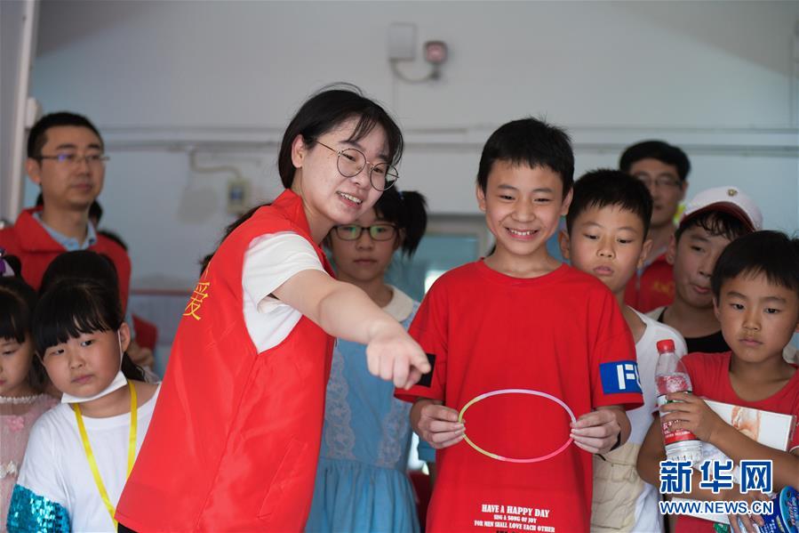 7月21日,在余姚市小曹娥镇的辛慧学校暑期乐园里,孩子们在志愿者的带领下玩趣味游戏。 正值暑假,浙江省余姚市外来务工人员的子女们纷纷从家乡来到余姚与父母们团聚。为了解除家长们的后顾之忧并让来自异地的“小候鸟”们能拥有充实快乐的暑假生活,余姚市大城小爱公益服务中心的青年志愿者组织开展多期以“多彩暑期 快乐成长”为主题的暑期乐园活动,内容包括安排文化课程、书画兴趣课、趣味手工课等,同时还给“小候鸟”们准备了暑期清凉大礼包,让他们在异乡度过一个快乐的暑期。 新华社记者 徐昱 摄