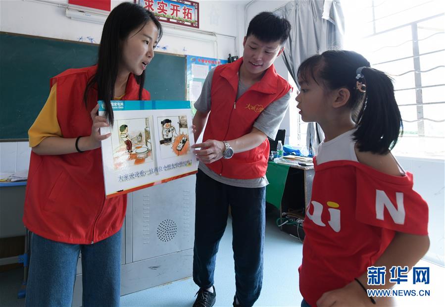 7月21日,在余姚市小曹娥镇的辛慧学校暑期乐园里,余姚市大城小爱公益服务中心的青年志愿者们在给孩子们上暑期安全课。 正值暑假,浙江省余姚市外来务工人员的子女们纷纷从家乡来到余姚与父母们团聚。为了解除家长们的后顾之忧并让来自异地的“小候鸟”们能拥有充实快乐的暑假生活,余姚市大城小爱公益服务中心的青年志愿者组织开展多期以“多彩暑期 快乐成长”为主题的暑期乐园活动,内容包括安排文化课程、书画兴趣课、趣味手工课等,同时还给“小候鸟”们准备了暑期清凉大礼包,让他们在异乡度过一个快乐的暑期。 新华社记者 徐昱 摄
