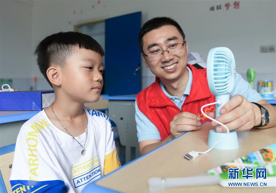 7月21日,在余姚市小曹娥镇的辛慧学校暑期乐园里,余姚市大城小爱公益服务中心的青年志愿者在教孩子如何使用暑期清凉大礼包里的迷你风扇。 正值暑假,浙江省余姚市外来务工人员的子女们纷纷从家乡来到余姚与父母们团聚。为了解除家长们的后顾之忧并让来自异地的“小候鸟”们能拥有充实快乐的暑假生活,余姚市大城小爱公益服务中心的青年志愿者组织开展多期以“多彩暑期 快乐成长”为主题的暑期乐园活动,内容包括安排文化课程、书画兴趣课、趣味手工课等,同时还给“小候鸟”们准备了暑期清凉大礼包,让他们在异乡度过一个快乐的暑期。 新华社记者 徐昱 摄
