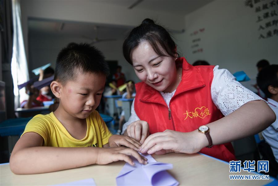 7月21日,在余姚市小曹娥镇的辛慧学校暑期乐园里,余姚市大城小爱公益服务中心的青年志愿者在手工课上指导孩子们折纸飞机。 正值暑假,浙江省余姚市外来务工人员的子女们纷纷从家乡来到余姚与父母们团聚。为了解除家长们的后顾之忧并让来自异地的“小候鸟”们能拥有充实快乐的暑假生活,余姚市大城小爱公益服务中心的青年志愿者组织开展多期以“多彩暑期 快乐成长”为主题的暑期乐园活动,内容包括安排文化课程、书画兴趣课、趣味手工课等,同时还给“小候鸟”们准备了暑期清凉大礼包,让他们在异乡度过一个快乐的暑期。 新华社记者 徐昱 摄