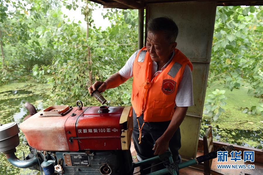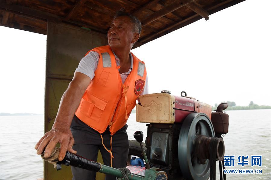 7月20日,在安庆市海口镇,王启干在开船前做安全检查。 王启干,今年70岁,安徽省安庆市海口镇培文村人,从1979年开始,在当地的西江上摆渡,2017年因年纪大而“退休”。 今年受强降雨影响,西江水位暴涨,淹没了通往培文村的道路,转移村民、抢险救灾等都因无法通行而成了难题,村干部紧急联系王启干,王启干毫不犹豫地答应,重启摆渡船。 经过连夜的检查和调试,从7月11日开始,王启干驾着已停摆三年的船“重出江湖”,在儿子和儿媳共同帮助下,每天往返于西江两岸,帮忙转移群众、运送物资、接送参与抢险救灾的解放军官兵。 新华社记者 周牧 摄