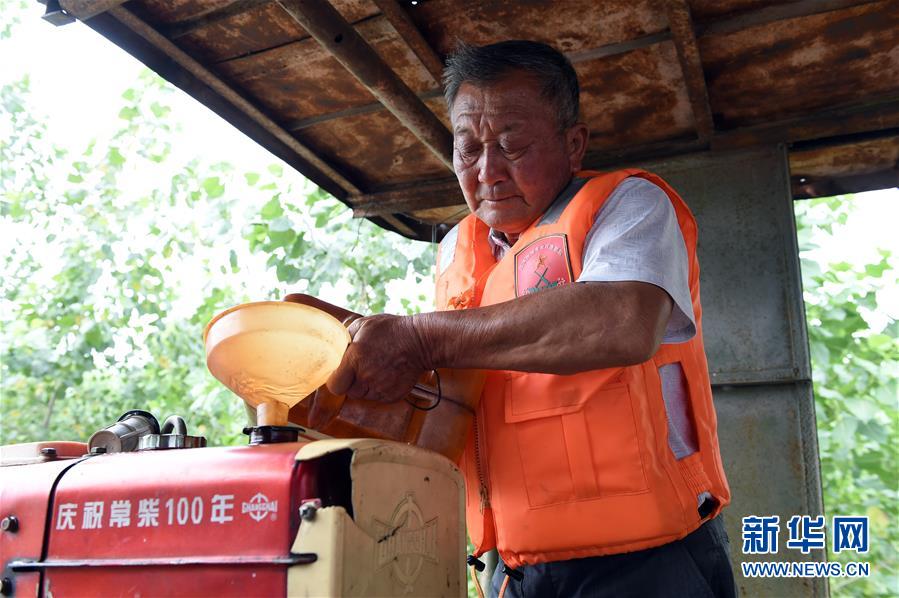 7月20日,在安庆市海口镇,王启干给渡船添加柴油。 王启干,今年70岁,安徽省安庆市海口镇培文村人,从1979年开始,在当地的西江上摆渡,2017年因年纪大而“退休”。 今年受强降雨影响,西江水位暴涨,淹没了通往培文村的道路,转移村民、抢险救灾等都因无法通行而成了难题,村干部紧急联系王启干,王启干毫不犹豫地答应,重启摆渡船。 经过连夜的检查和调试,从7月11日开始,王启干驾着已停摆三年的船“重出江湖”,在儿子和儿媳共同帮助下,每天往返于西江两岸,帮忙转移群众、运送物资、接送参与抢险救灾的解放军官兵。 新华社记者 周牧 摄