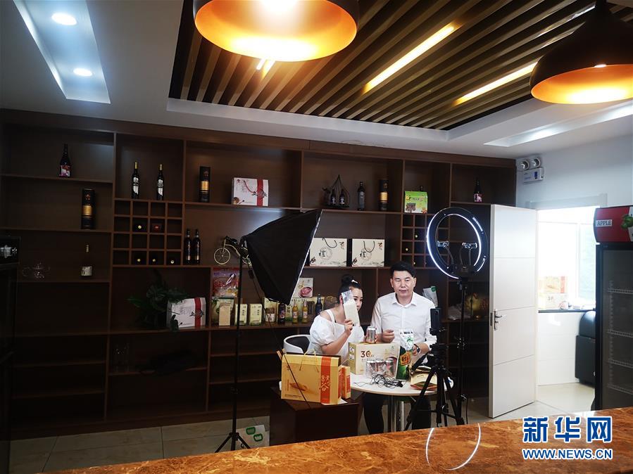 双鸭山市电子商务发展服务中心的电商团队在直播推介产品(7月16日摄)。新华社记者 董宝森 摄
