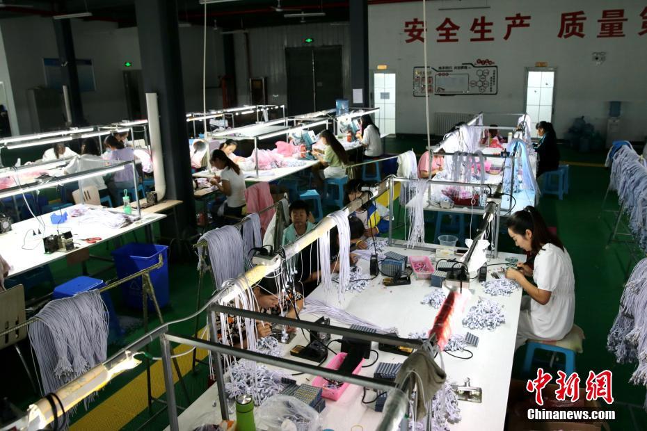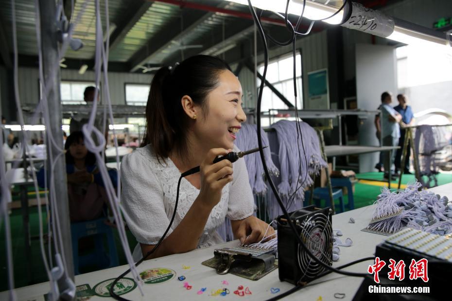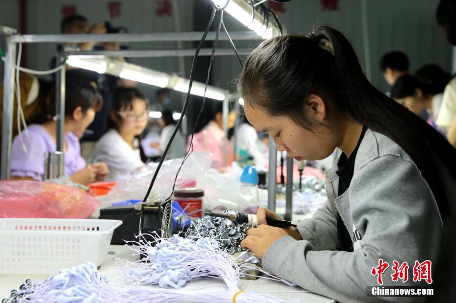 7月21日,社区居民在“社区工厂”工作。陕西省商洛市山阳县富桥社区共安置易地扶贫搬迁对象3000余人。该社区依托己建成的金鸡扶贫产业园、和丰阳光食用菌产业园、电子设备和肠衣护套加工厂就近安置就业580人,其中贫困劳动力320人,帮助了不少出不了远门又需要照顾老人孩子的妇女就业。中新社记者 张远 摄
