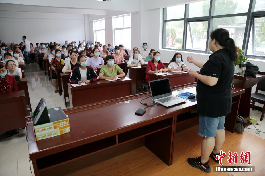 7月21日,社区居民接受培训。陕西省商洛市山阳县富桥社区共安置易地扶贫搬迁对象3000余人。该社区依托己建成的金鸡扶贫产业园、和丰阳光食用菌产业园、电子设备和肠衣护套加工厂就近安置就业580人,其中贫困劳动力320人,帮助了不少出不了远门又需要照顾老人孩子的妇女就业。中新社记者 张远 摄