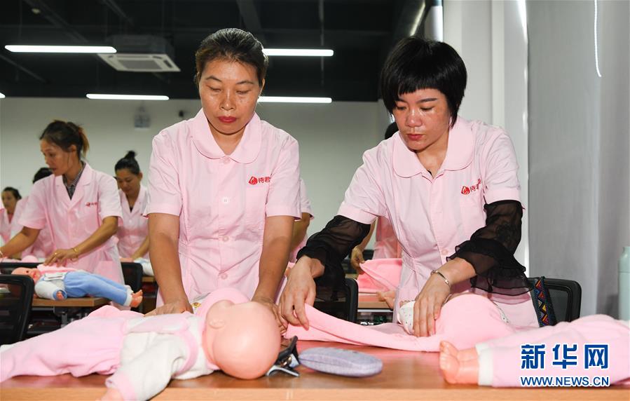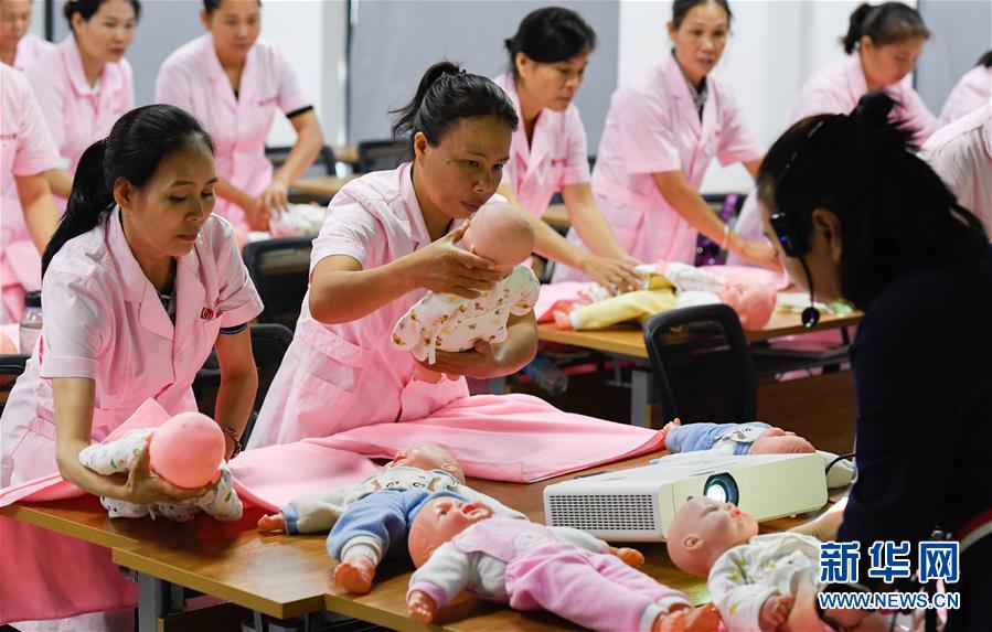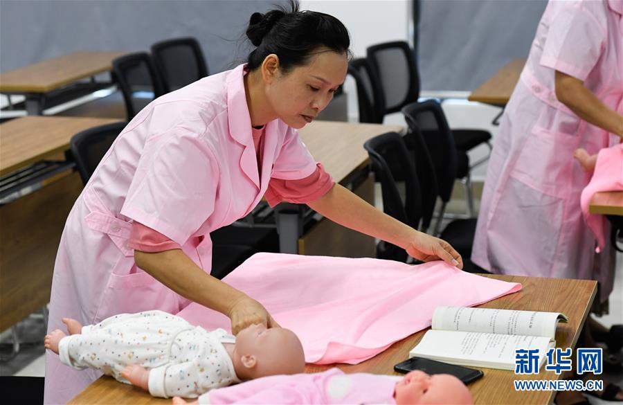 7月21日,在海南省儋州市的海南西部家庭服务中心,学员在课上练习婴儿包单。新华社记者 杨冠宇 摄