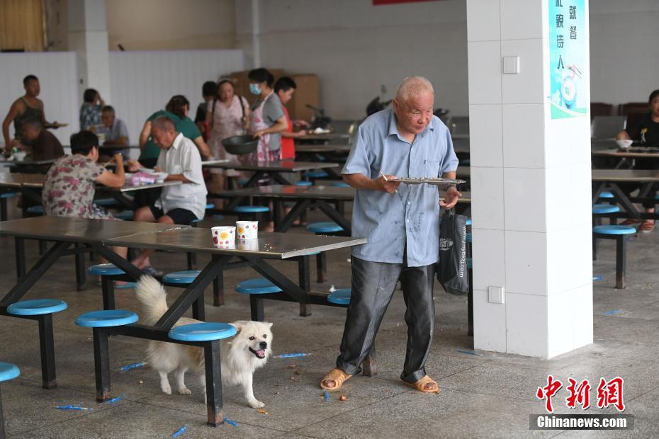 7月23日,在安徽巢湖柘皋中学安置点,村民在食堂享用免费发放的晚餐。受连日强降雨影响,巢湖水位、柘皋河水位上涨,造成部分村镇被洪水围困。柘皋镇在抗洪抢险的同时,及时转移当地民众。目前该安置点已安置村民300余人,安置点为村民提供住宿、饮食及医疗等服务。中新社记者 韩苏原 摄