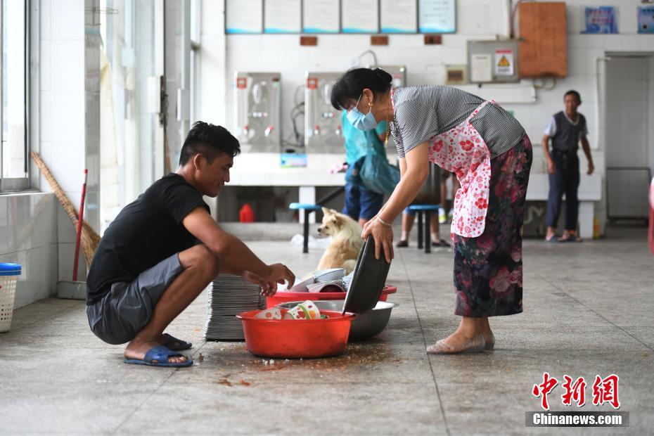 7月23日,在安徽巢湖柘皋中学安置点,村民蒋文武作为志愿者在食堂为大家服务。受连日强降雨影响,巢湖水位、柘皋河水位上涨,造成部分村镇被洪水围困。柘皋镇在抗洪抢险的同时,及时转移当地民众。目前该安置点已安置村民300余人,安置点为村民提供住宿、饮食及医疗等服务。中新社记者 韩苏原 摄