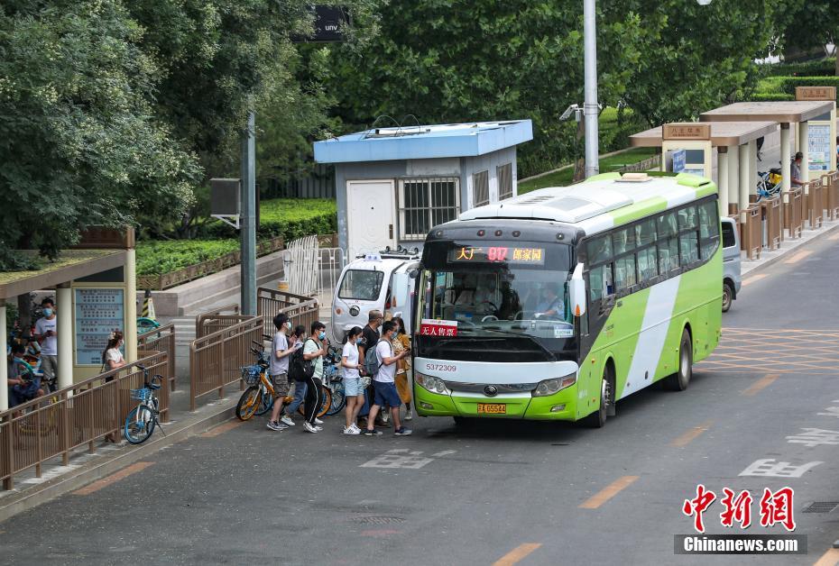 7月26日,乘客有序乘坐北京817路公交车。当日,前期因疫情影响暂停运营的805快、817路、930路等10条跨京冀公交线路恢复全线运营。中新社记者 贾天勇 摄
