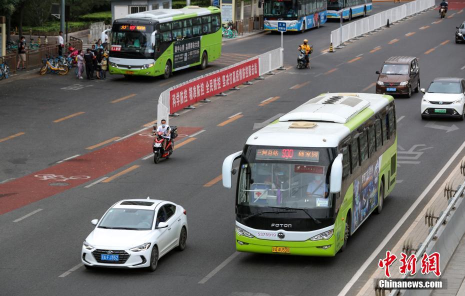 7月26日,930路公交车行驶在北京东四环四惠桥。当日,前期因疫情影响暂停运营的805快、817路、930路等10条跨京冀公交线路恢复全线运营。中新社记者 贾天勇 摄