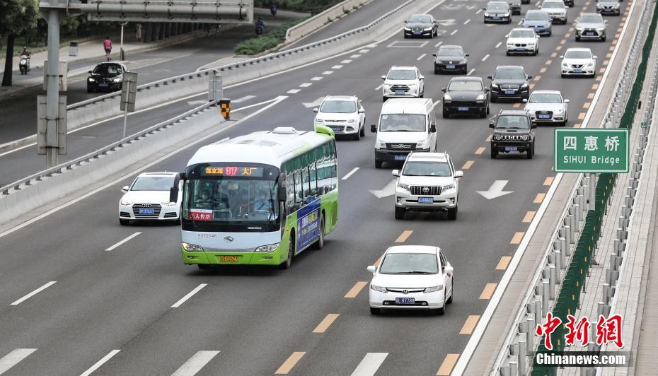 7月26日,817路公交车行驶在北京东四环四惠桥。当日,前期因疫情影响暂停运营的805快、817路、930路等10条跨京冀公交线路恢复全线运营。中新社记者 贾天勇 摄