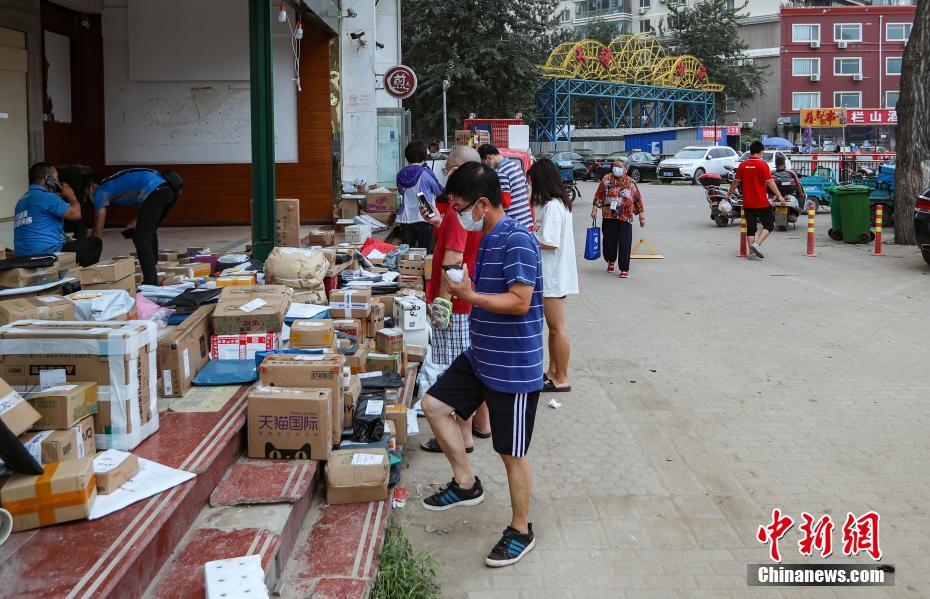 7月29日,北京市昌平区天通苑西三区入口,快递外卖人员已无法进入小区,居民在小区外挑选快递。7月27日,北京天通苑西三区出现一例大连关联病例。昌平区迅速将该小区应急响应级别调整为二级,小区卡口严格执行测温、查证等防控措施,外来人员及车辆禁止入内。中新社记者 贾天勇 摄