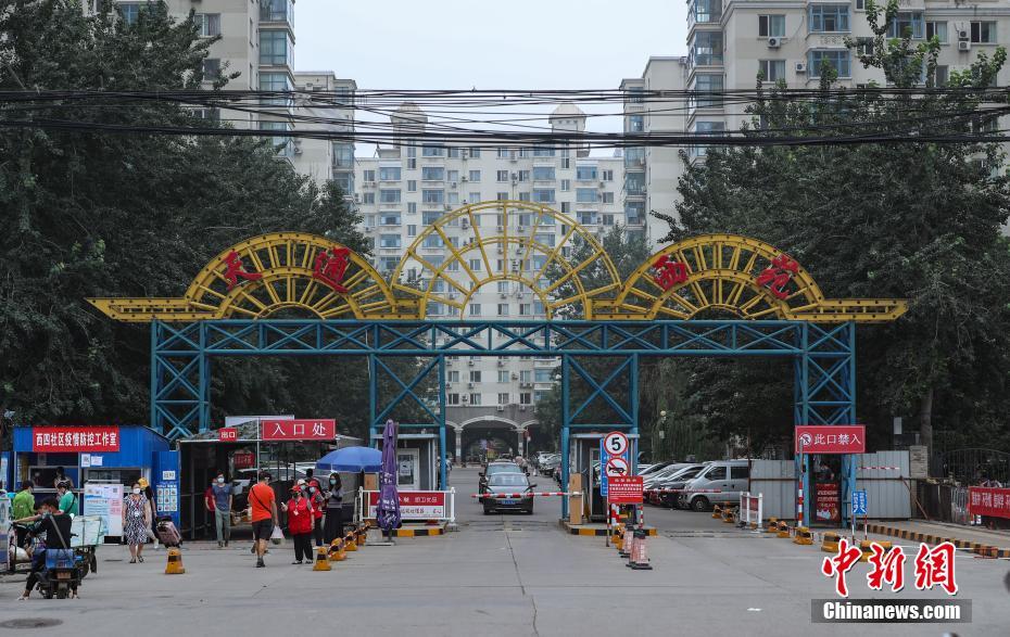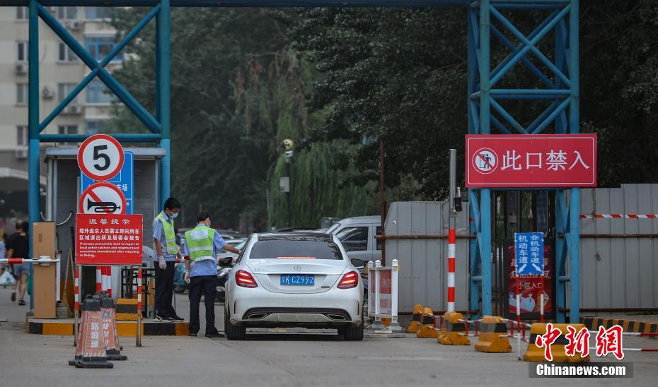 7月29日,北京市昌平区天通苑西三区入口,居民进入社区接受测温、查证。7月27日,北京天通苑西三区出现一例大连关联病例。昌平区迅速将该小区应急响应级别调整为二级,小区卡口严格执行测温、查证等防控措施,外来人员及车辆禁止入内。中新社记者 贾天勇 摄