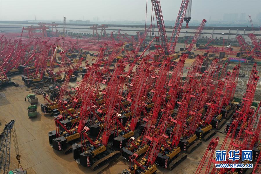 7月29日在位于浙江省湖州市吴兴高新区的浙江三一装备有限公司拍摄的等待交付的履带起重机(无人机照片)。据了解,该企业正处于满负荷生产状态。新华社记者 黄宗治 摄
