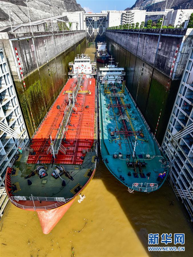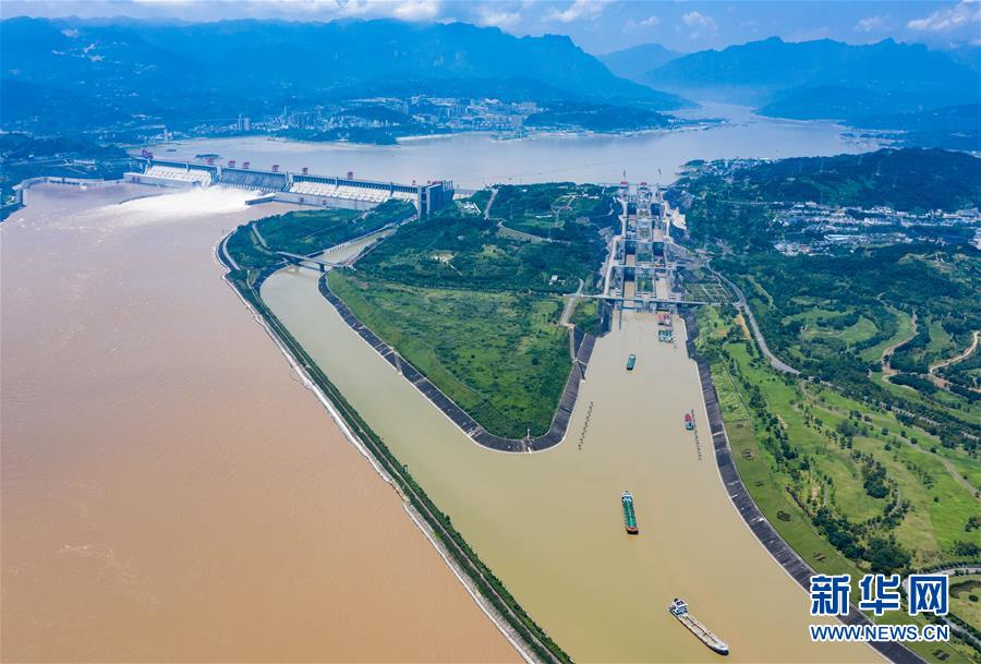 8月1日,船舶通过三峡五级船闸(无人机照片)。 水利部长江水利委员会7月31日发布调度令:8月1日5时起,三峡水库出库流量按34500立方米每秒下泄,为近期因为长江汛情而滞留的船舶创造通行条件,及时疏散滞留船舶。 新华社发(郑家裕 摄)