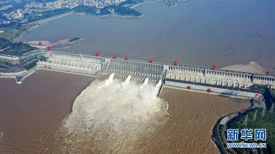 8月1日,三峡大坝开启4个泄洪深孔泄洪,比前一日减少2孔,将下泄流量控制在34500立方米每秒(无人机照片)。 水利部长江水利委员会7月31日发布调度令:8月1日5时起,三峡水库出库流量按34500立方米每秒下泄,为近期因为长江汛情而滞留的船舶创造通行条件,及时疏散滞留船舶。 新华社发(文桭效 摄)