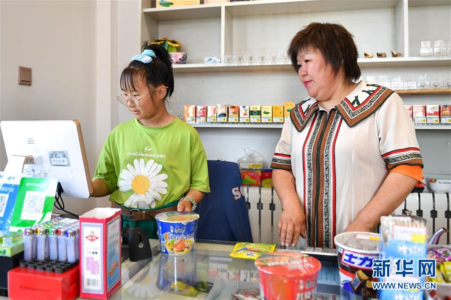 索云(右)在位于敖鲁古雅鄂温克族乡的自家超市内,指导女儿为顾客结账(7月14日摄)。 新华社记者 贝赫 摄