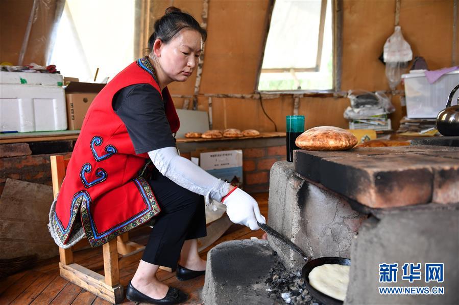 杜峰在位于敖鲁古雅鄂温克族乡的鄂库娜列巴房内烤列巴(7月14日摄)。 新华社记者 贝赫 摄