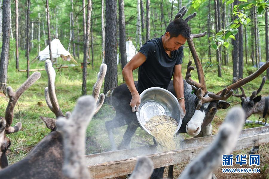 古木森在根河市乌力库玛林场内的驯鹿放养点喂驯鹿(7月13日摄)。 新华社记者 贝赫 摄