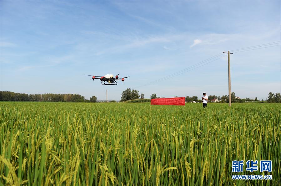 8月4日,在肥东县店埠镇,农业科技公司的技术人员杨汉林操作无人机喷洒农药。