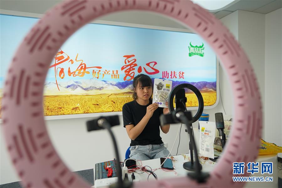 8月4日,工作人员在“青品汇”全国消费扶贫青海众创基地直播销售。 近日,全国消费扶贫青海众创基地以“政府搭台、企业唱戏、市场化运营”的形式打造“青品汇”电商平台,将青海省的高原特色产品免费引入平台,用消费驱动增长,落实消费扶贫,推动青海39个贫困县、200多家高原特色农产品企业高质量发展。 新华社记者 邢广利 摄