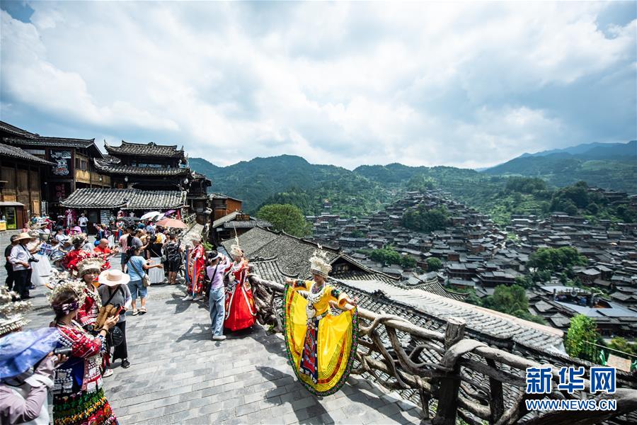 游客在贵州省雷山县西江千户苗寨景区内拍照留念(7月31日摄)。 新华社记者 陶亮 摄