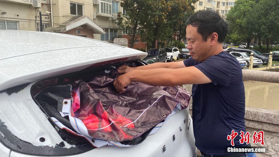 8月4日,一位市民补救在台风中被异物砸破的车辆后挡风玻璃。4日3时30分前后,乐清16年后再次迎来台风登陆,登陆时中心附近最大风力13级(38米/秒)。中新社记者 王刚 摄