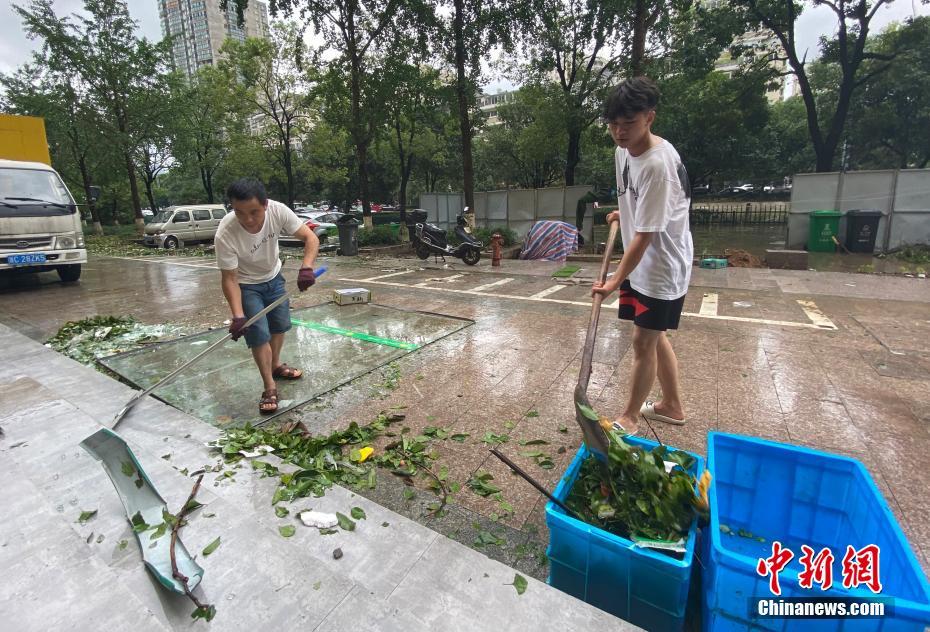 8月4日,两位市民在清扫地面。4日3时30分前后,乐清16年后再次迎来台风登陆,登陆时中心附近最大风力13级(38米/秒)。中新社记者 王刚 摄