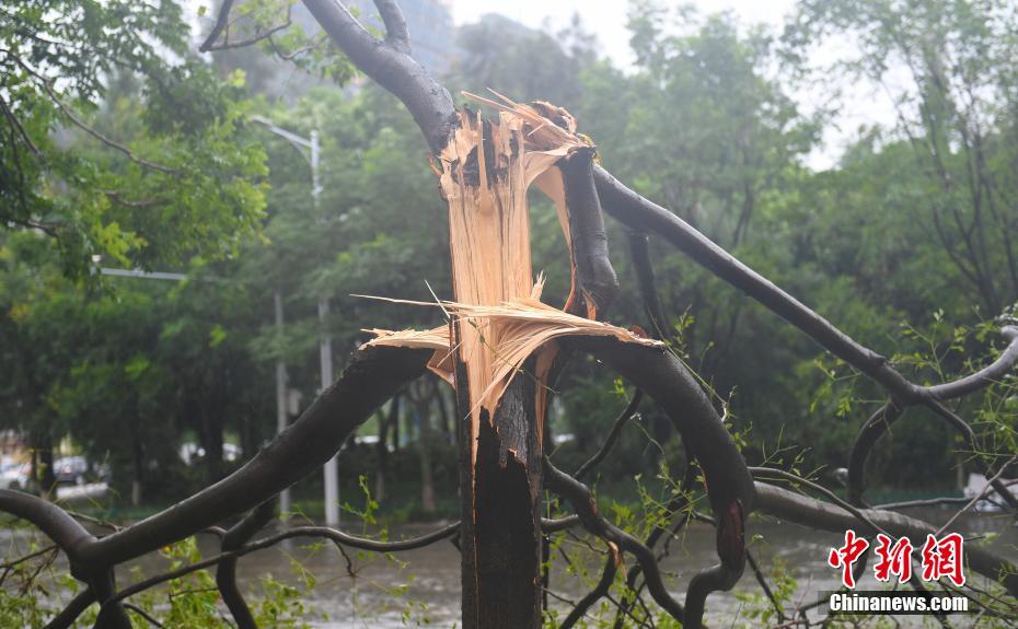 8月4日,乐清马路边粗壮的树干被台风吹断。当日,今年第4号台风“黑格比”在浙江乐清登陆,疾风骤雨之下,乐清众多城市设施严重损毁。中新社记者 王刚 摄