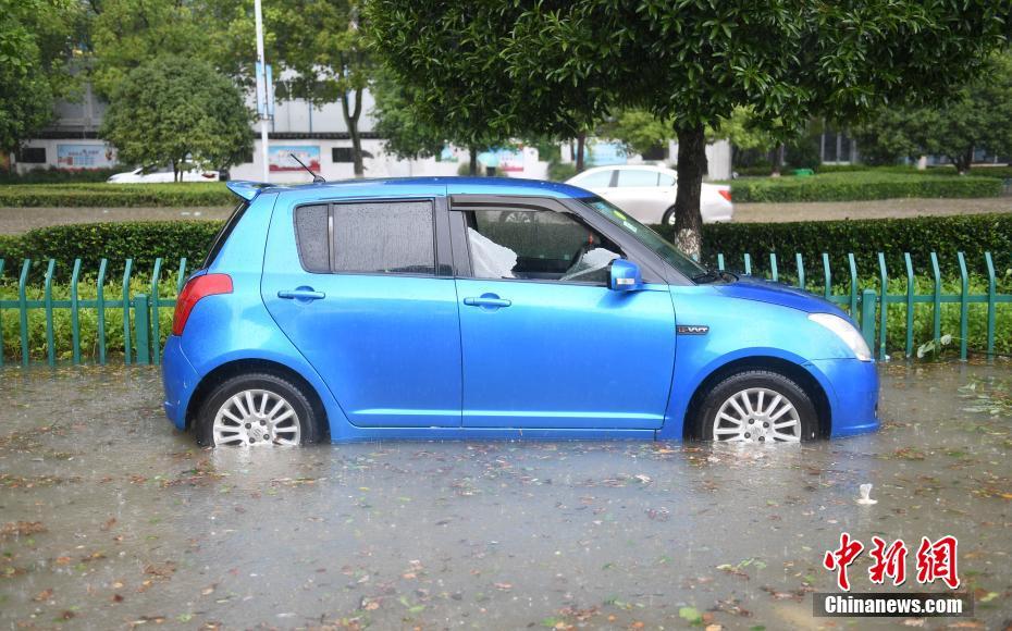 8月4日,一辆车窗被砸破的轿车停在积水中。当日,今年第4号台风“黑格比”在浙江乐清登陆,疾风骤雨之下,乐清众多城市设施严重损毁。中新社记者 王刚 摄