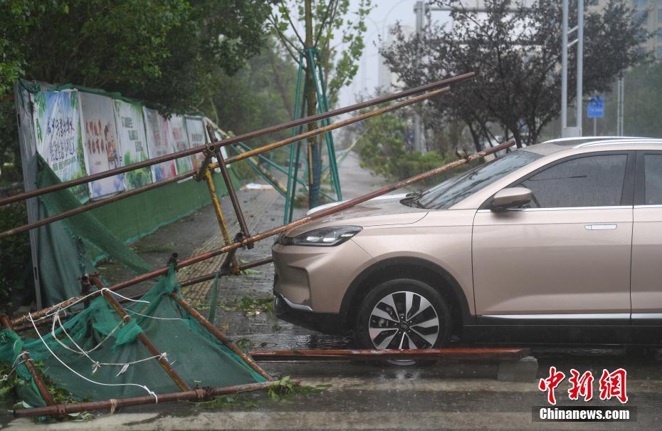 8月4日,一辆小轿车压在被台风吹倒的施工脚手架下。当日,今年第4号台风“黑格比”在浙江乐清登陆,疾风骤雨之下,乐清众多城市设施严重损毁。中新社记者 王刚 摄
