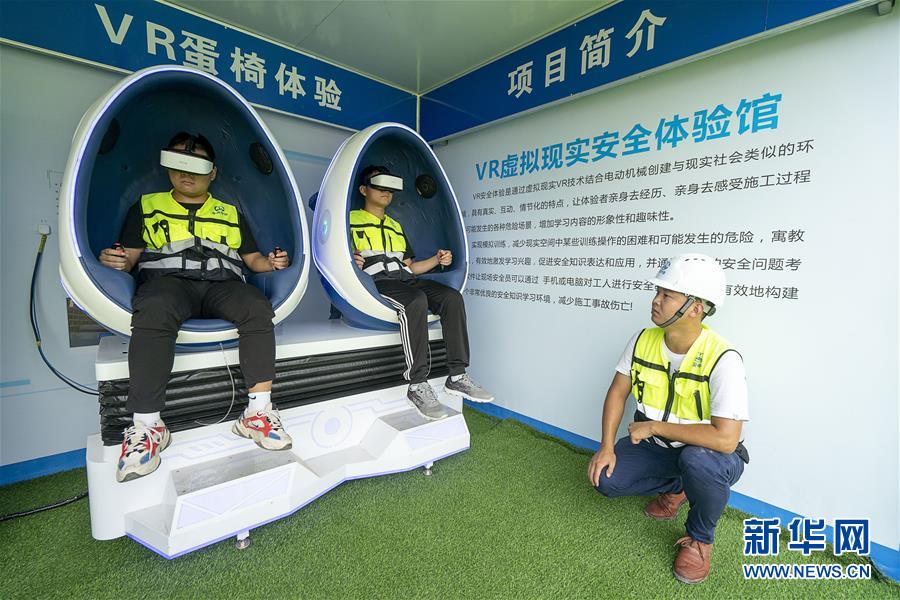 8月6日,工人在VR安全体验馆内接受安全教育。 近日,武汉迎来持续高温天气。为保证施工安全,在武汉市黄家湖污水处理厂三期扩建工程工地,中铁市政环境建设有限公司对工人开展安全教育,通过体验VR安全体验馆、讲解安全生产知识、开展安全技能培训等,提高建筑工人的安全生产意识。 新华社记者 熊琦 摄