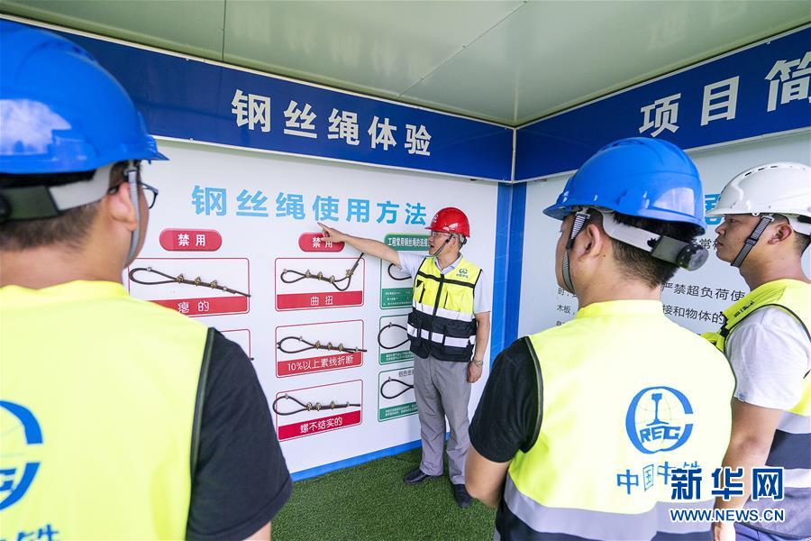 8月6日,工人在开展安全技能培训。 近日,武汉迎来持续高温天气。为保证施工安全,在武汉市黄家湖污水处理厂三期扩建工程工地,中铁市政环境建设有限公司对工人开展安全教育,通过体验VR安全体验馆、讲解安全生产知识、开展安全技能培训等,提高建筑工人的安全生产意识。 新华社记者 熊琦 摄
