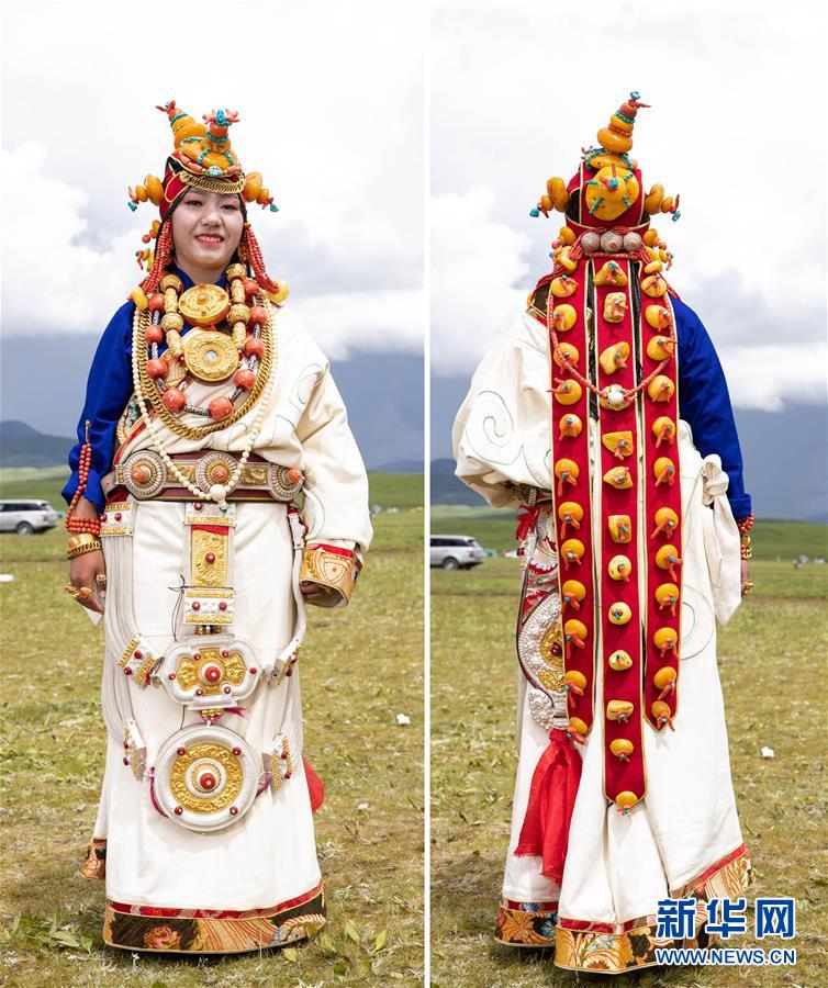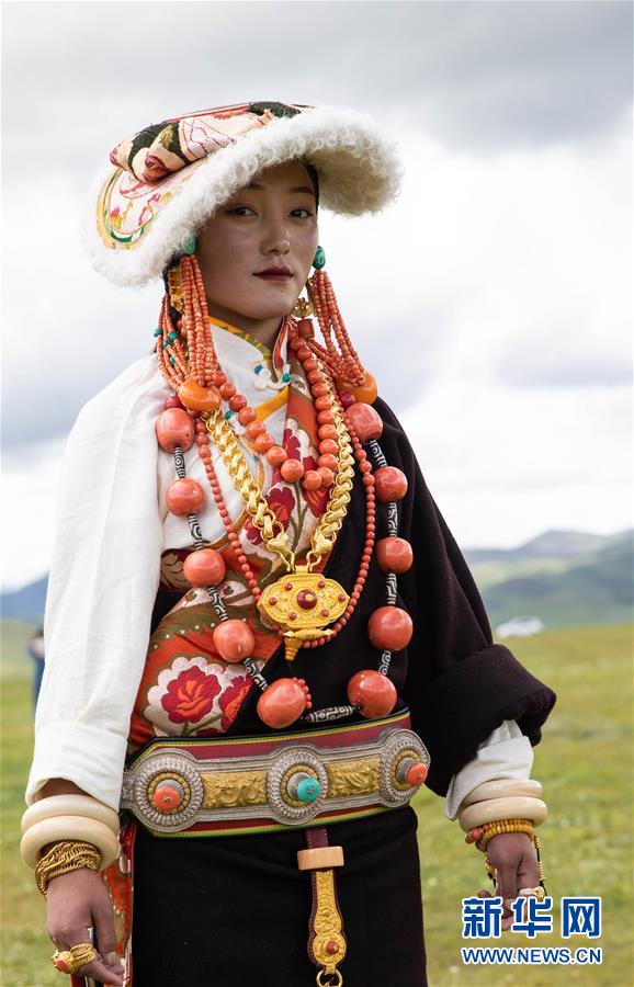 一位身着色达现代藏族服饰的藏族姑娘在色达县扎青塘草原上。这是她身上的饰物(拼版照片,8月7日摄)。新华社记者 江宏景摄
