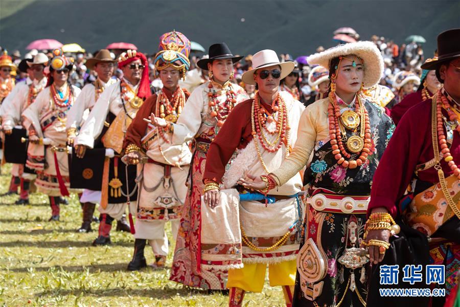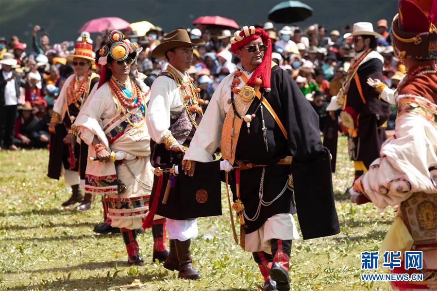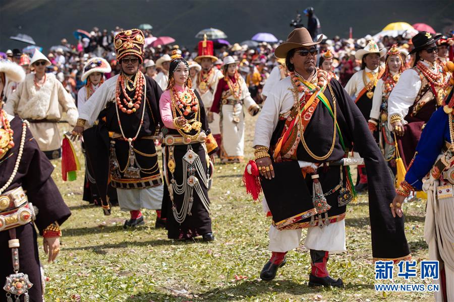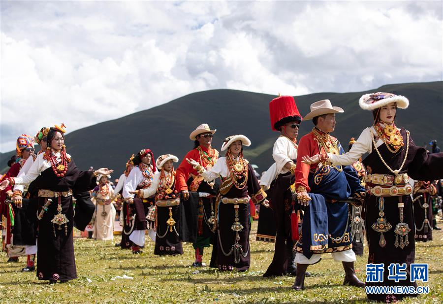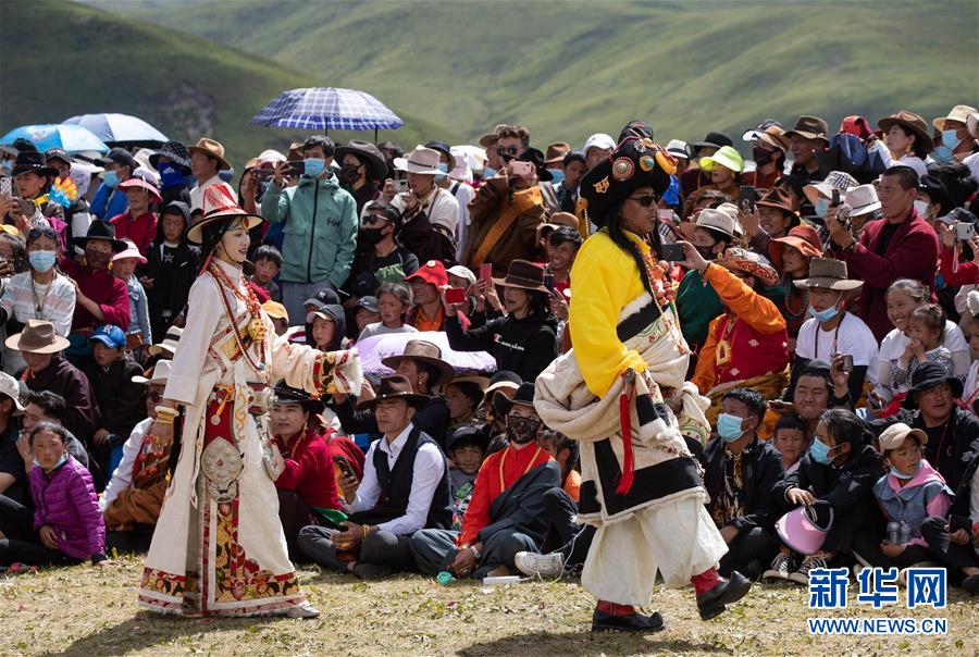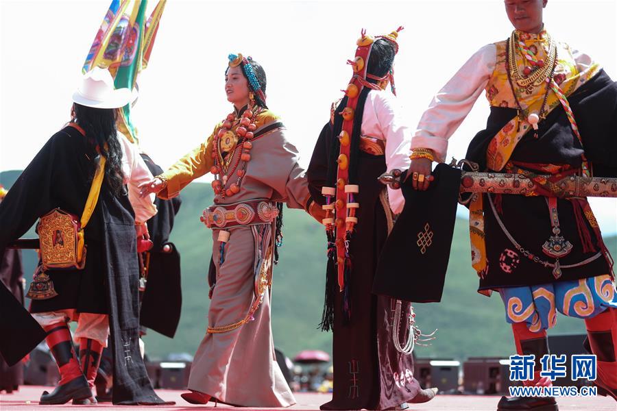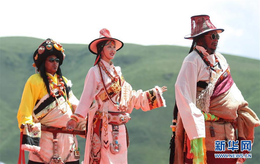 8月7日,当地藏族群众身着色达传统服饰和现代藏族服饰进行展演。新华社记者 江宏景摄
