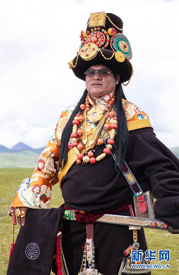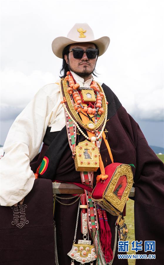 8月7日,一位身着色达传统藏族服饰的藏族小伙子在色达县扎青塘草原上。新华社记者 江宏景摄