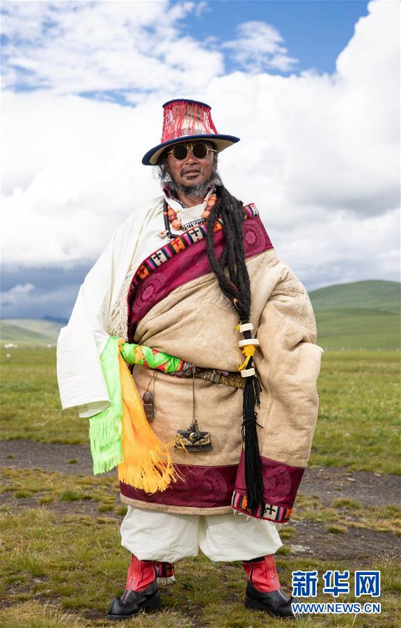8月7日,一位身着色达传统藏族服饰的藏族老大爷在色达县扎青塘草原上。新华社记者 江宏景摄
