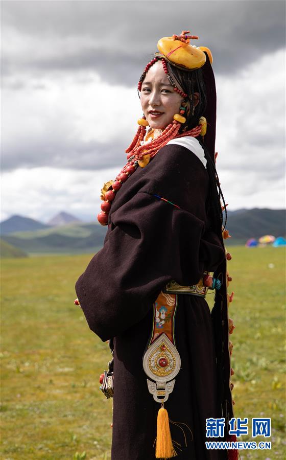 8月7日,一位身着色达现代藏族服饰的藏族姑娘在色达县扎青塘草原上。新华社记者 江宏景摄