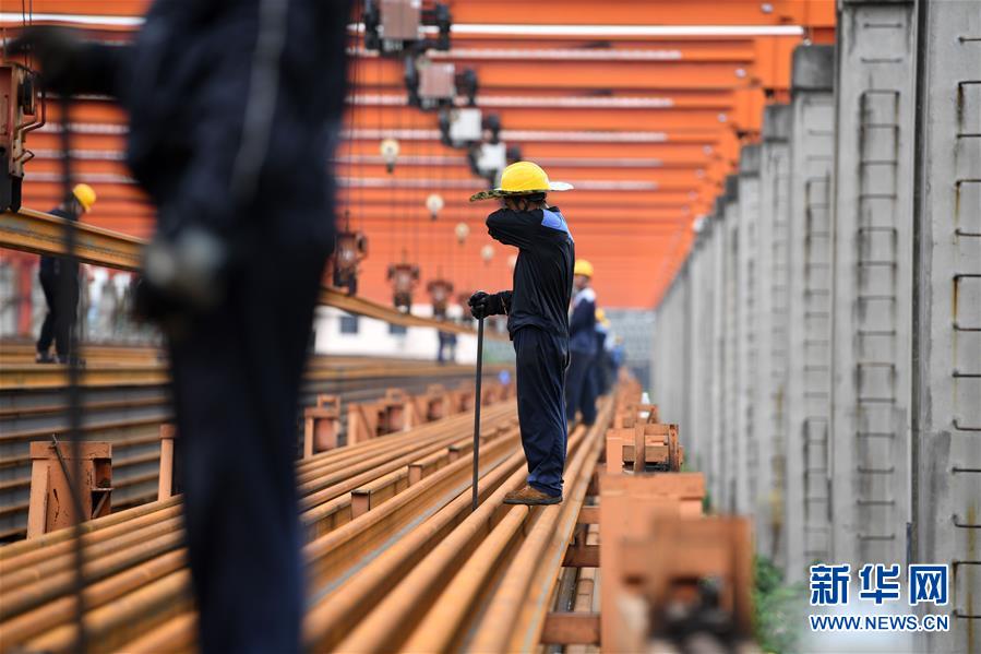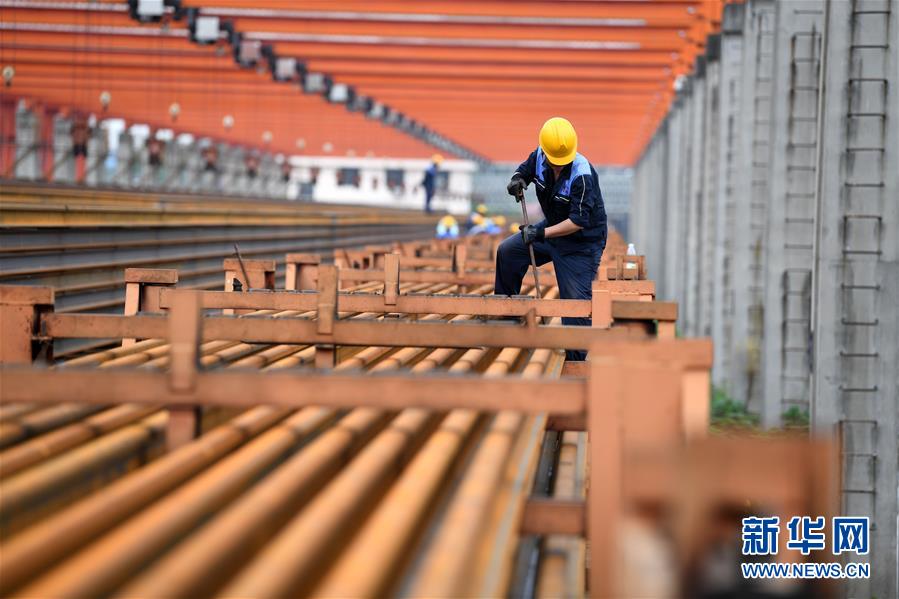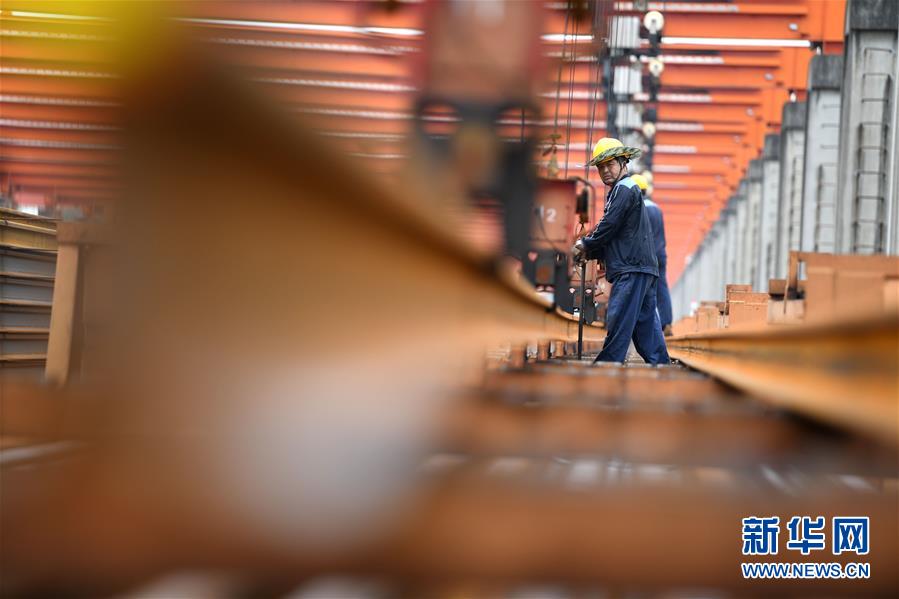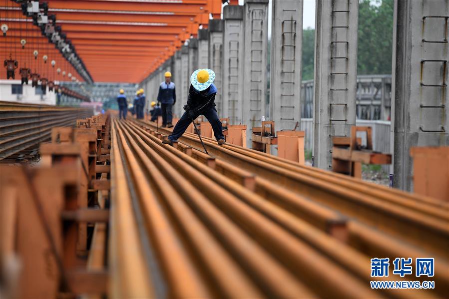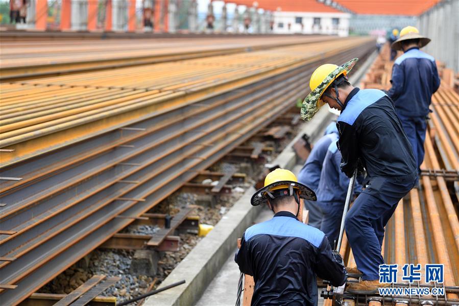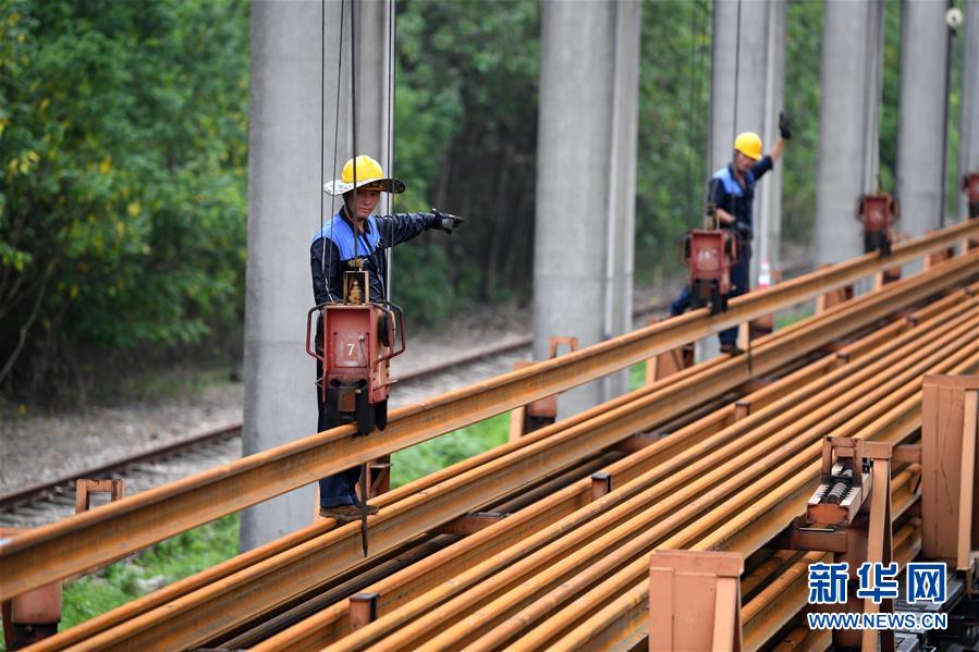 8月8日,工作人员在进行吊装钢轨作业。新华社记者刘军喜摄