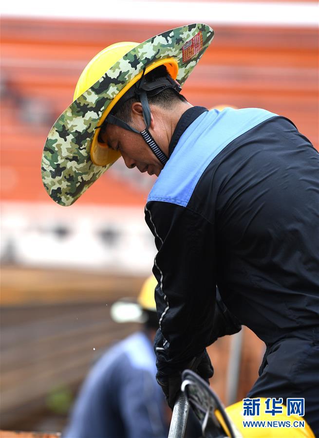 8月8日,工作人员在进行吊装钢轨作业。 新华社记者刘军喜摄
